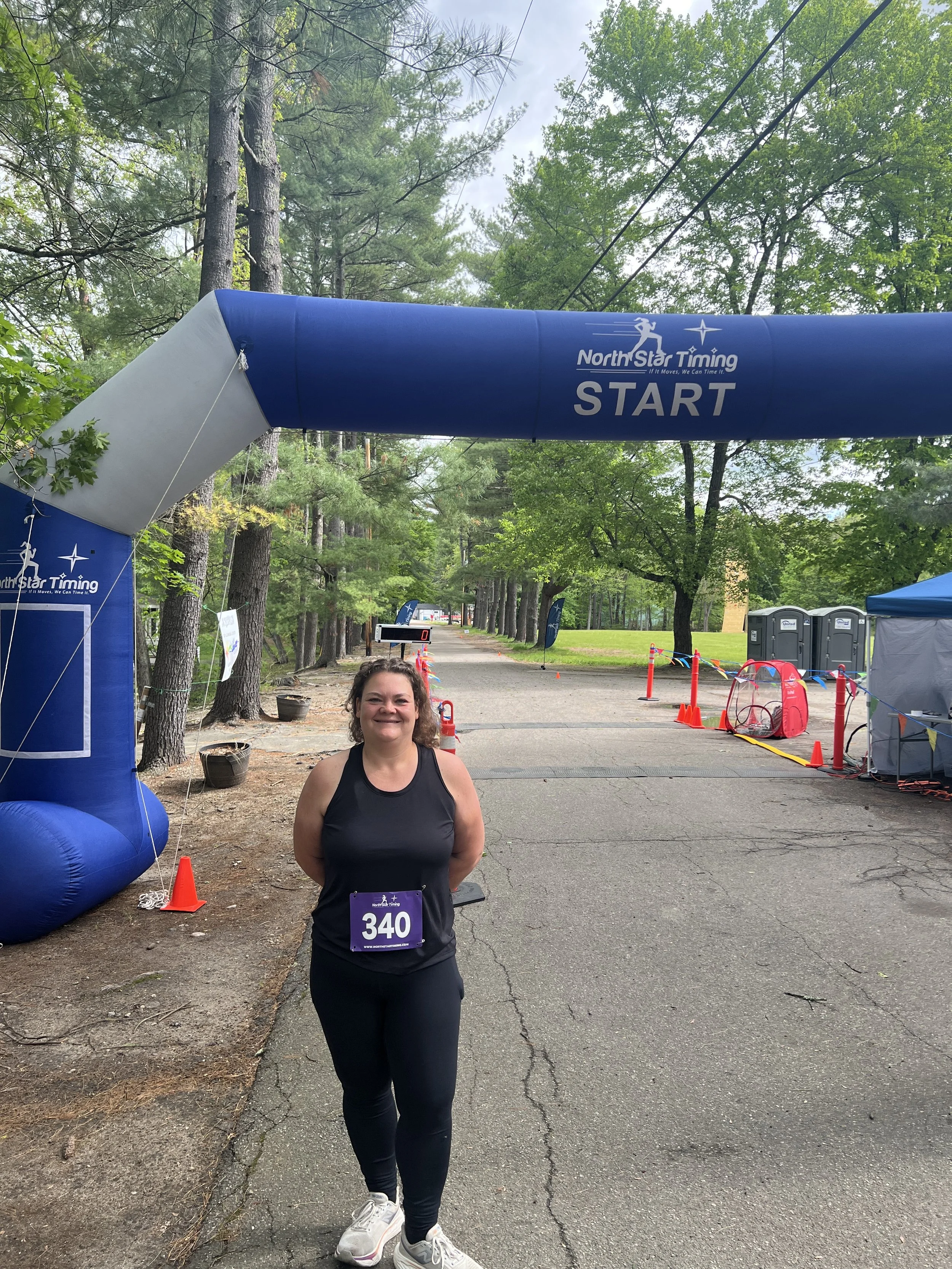 May: Brookline Bolt, Brookline, NH. I really enjoyed this race. The start line was at Camp Tevya. I ran 1.6 miles on the railtrail before turning back to the start line to complete a 5k. My husband stayed with me for this race to help keep me motivated. The scenery was pretty and with the race being on a railtrail it was nice and flat.