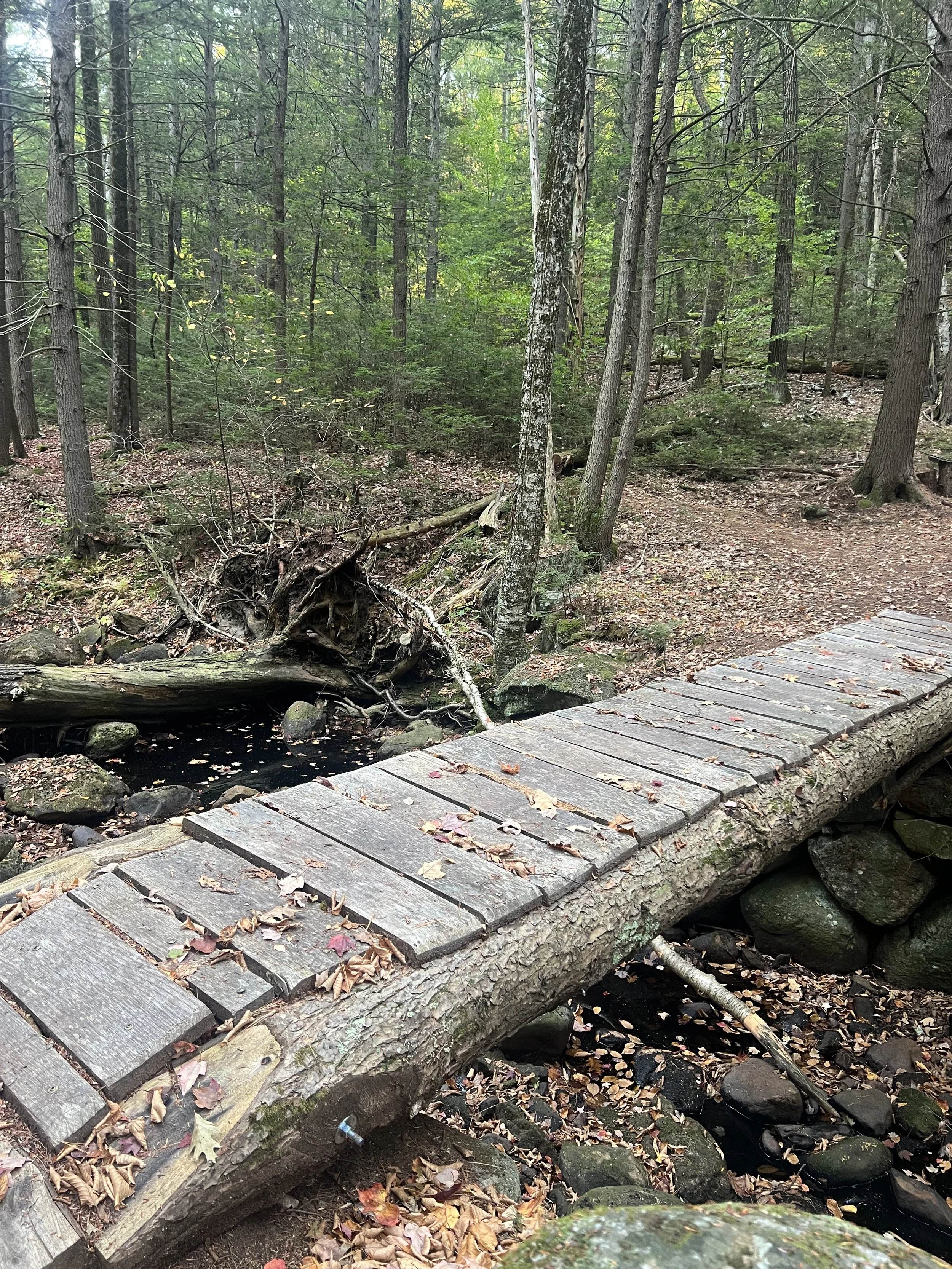 Right after the bridge you walk up a slight hill and connect to the loop if you would have gone to the left. There is also a small wooden bridge that crosses the stream to connect with the trail that goes along the other side of the water.
