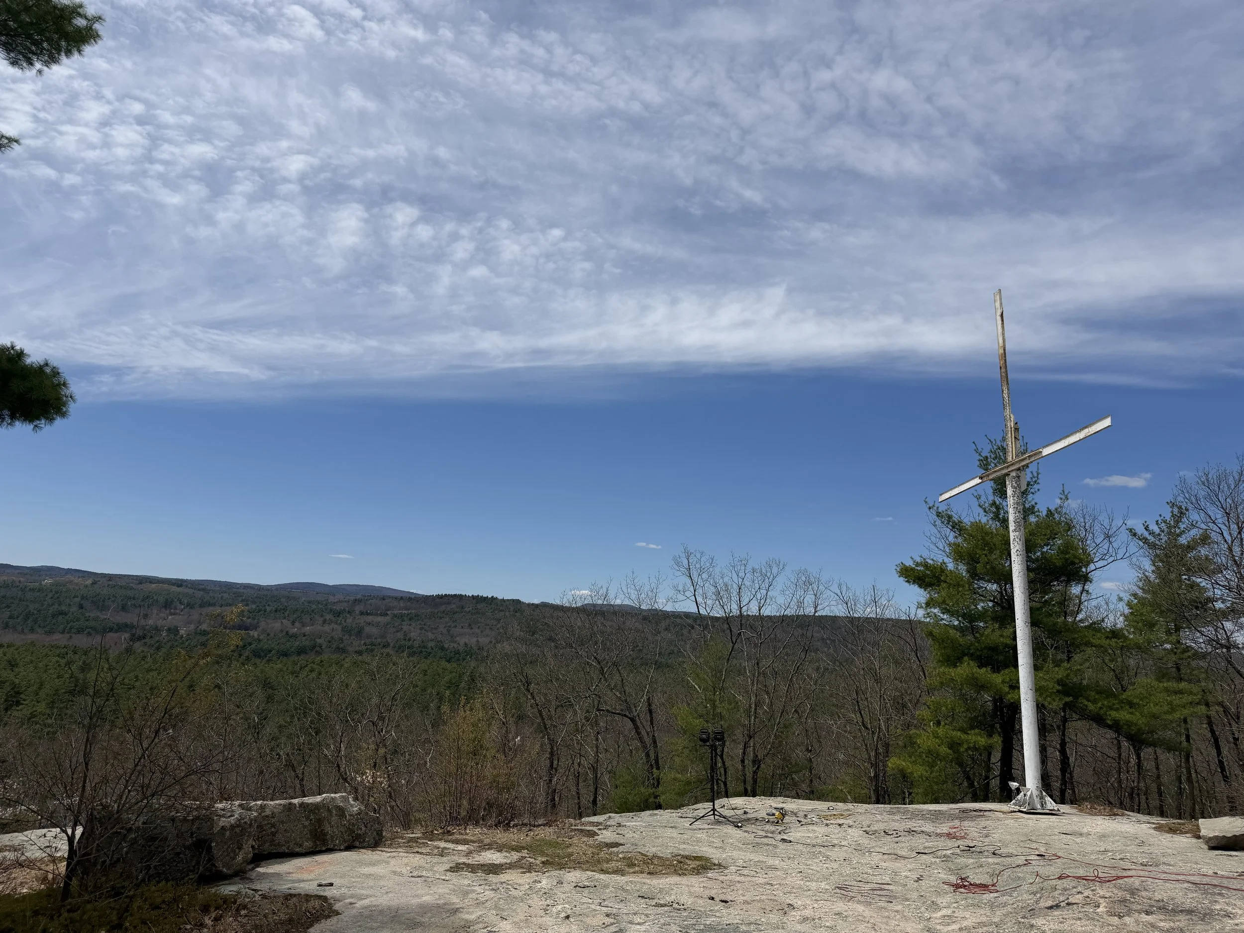 The trail was a steady incline meandering through the woods. After another quarter of a mile we took a left and could see the outlook. After walking a few more hundred feet we could see the ledges with the large cross on it.